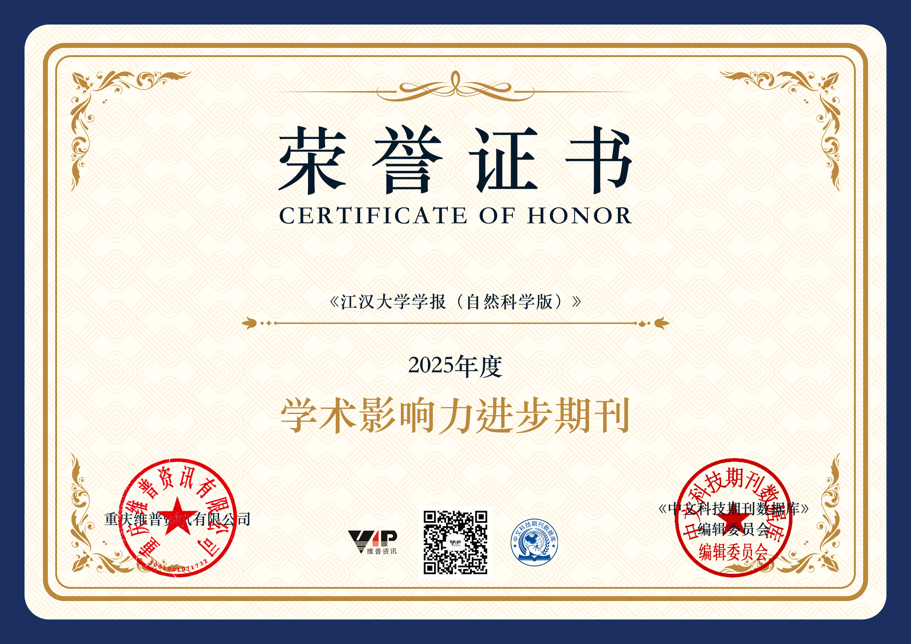 近日,2025年度维普资讯中文科技期刊评选结果正式公布,《江汉大学学报(自然科学版)》因学术影响力稳步提升、办刊质量持续优化,荣获“学术影响力进步期刊”称号。此项荣誉是对该刊工作的充分肯定,同时,也离不开学界同仁、广大作者与读者的长期信任与支持。