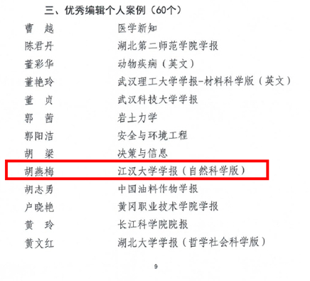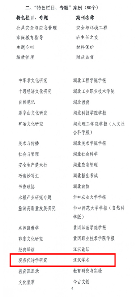 12月26日,首届湖北期刊高质量发展示范案例库入库名单正式公布,江汉大学期刊社获评多项优秀案例。其中,《江汉学术》成功入选“期刊优秀案例”,其教育部名栏“现当代诗学研究”入选“特色栏目、专题”案例;《江汉大学学报(自然科学版)》编辑胡燕梅入选“优秀编辑个人案例”,成为全省期刊界及编辑个人实践的优秀代表。